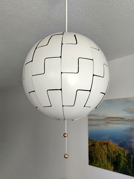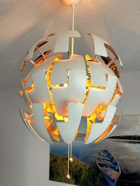 Beschreibung: lässt sich schliessen und öffnen, aussen weiss, innen kupferfarben, ergibt oranges Licht