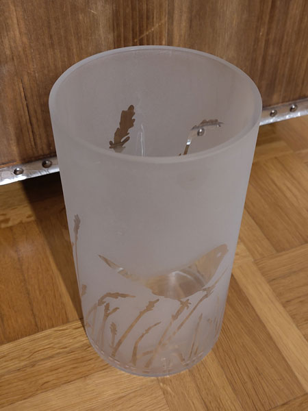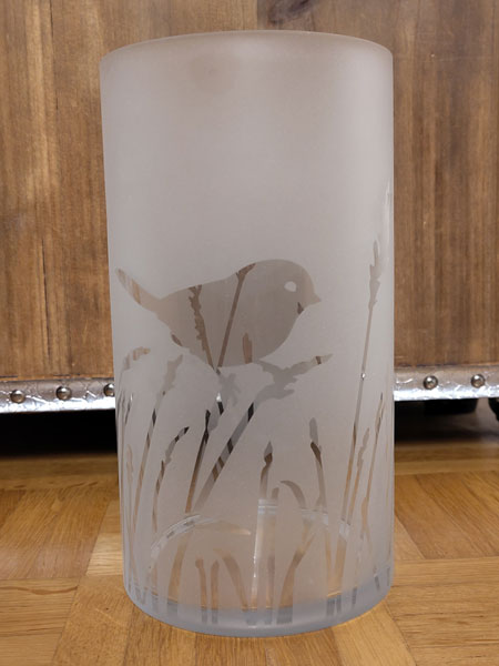 Beschreibung: Milchglas mit transparentem Motiv eines Singvogels und Halmen, ca. 20 cm hoch